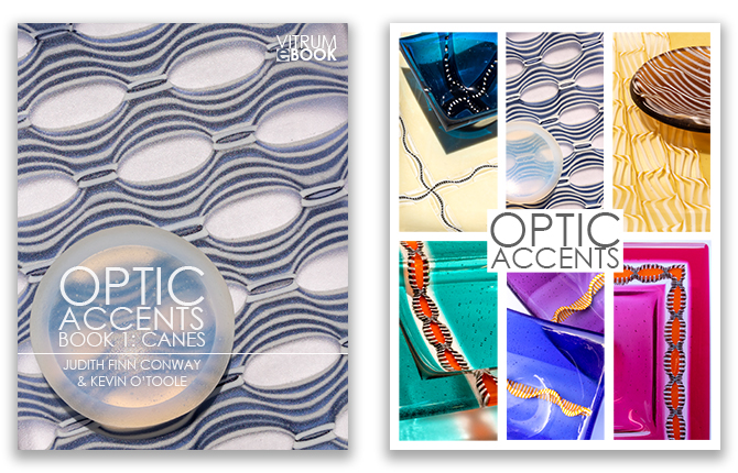 We proudly introduce Optic Accents, our new Vitrum Studio Book that explores original techniques for making pre-fired pattern canes. We’ll introduce you to the concepts, then take you step-by-step through the methods of making a variety of different Optic Canes that can be used to add a splash of complex design and color to your projects. |